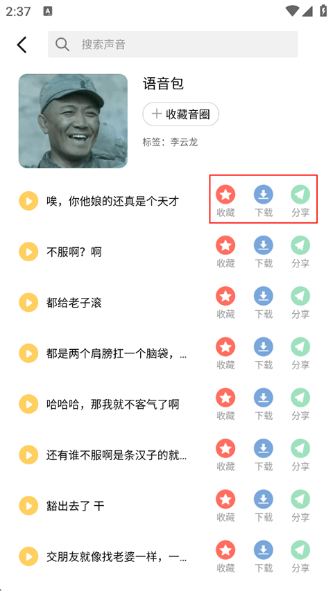 3、进入后平台支持收藏下载与分享语音包;
