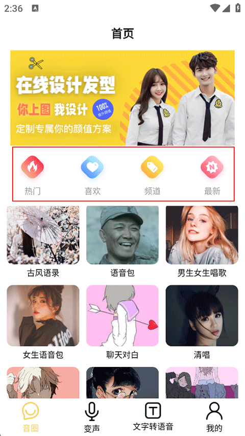 1、打开变声神器APP,在首页浏览热门推荐的语音包内容;