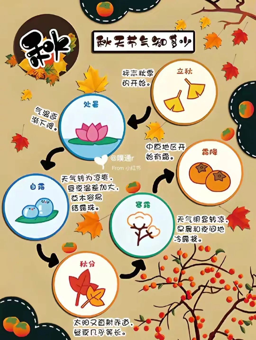 立秋(8月7-9日)、处暑(8月22-24日)、白露(9月7-9日)、秋分(9月22-24日)、寒露(10月7-9日)、霜降(10月23-24日)
