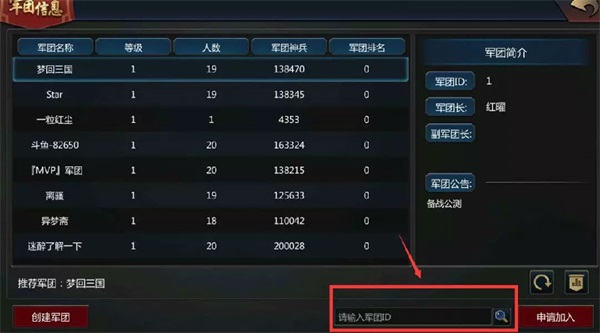 2、之后就需要搜索军团ID,申请加入自己心仪的军团。小编再悄悄告诉你哦,想让更多人知道你的军团,先记下自己的军团ID吧~