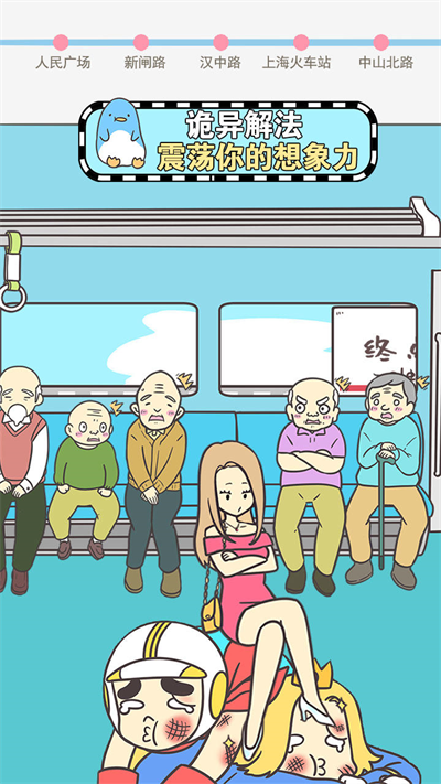 地铁上抢座是绝对不可能的是一款超级魔性的益智休闲解谜游戏,无厘头搞笑的游戏美术风格,简单有趣的操作手法,将给玩家带来不一样的游戏乐趣。与一般的解谜游戏相类似,在这里玩家将通过寻找隐藏的道具,以最佳、最合理的方式进行抢座占座,期间游戏中还有许多独特事件触发所带来的藏品等待你来收集。除此之外,游戏里面还拥有很多的小彩蛋,比如有不同的猫咪可以撸,但是玩家要注意,你最多可以撸三下,猫咪在被撸第四下时会挠人,里面的猛男大叔是个gay,如果点击了他就会抱你,甚至在晚上的列车也不安静,会有小丑会从箱子、座位底下甚至是包里出来吓你等,玩家可以在这里看到各式各样的沙雕场景,非常的有意思,感兴趣的小伙伴们快来下载体验一番吧。