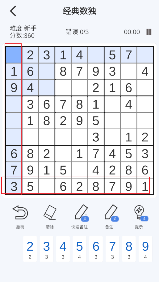 最让我觉得贴心的是它的数据追踪功能,每次玩完都会记录下用时、胜率、提示次数这些关键指标,帮助我找出自己的弱点并优化解题思路。玩游戏的步骤也很简单:打开游戏选难度,然后按照数独规则填数字就行了,错了还能撤销或者使用提示,特别适合像我这种刚开始接触数独的新手。