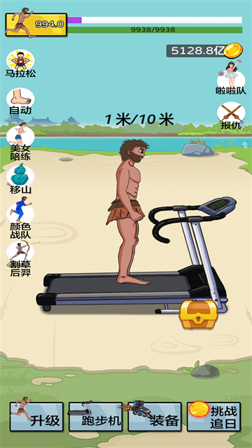 2、夸父在跑步机上跑步,初代跑步机10米获得金币奖励,点击屏幕的速度越快,跑的就越快。