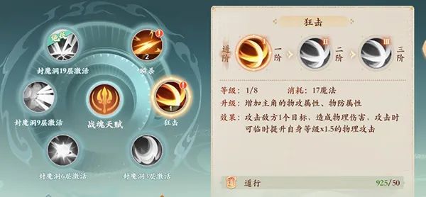 2技能:狂击,攻击1目标,临时提升等级*1.5物理攻击。(2阶:技能伤害结果增加10%、3阶:技能伤害结果增加10%)