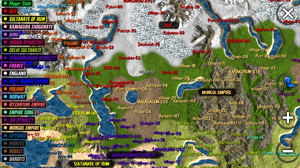 1、刚进入游戏会随机出现在地图上,这个时候没有任何士兵,身上的货币也有限,点击地图打开地图,可以看到上面有村庄以及各种城堡的所在地,名字显示为红色的是我们的敌人势力,过去后只能开战无法交易。