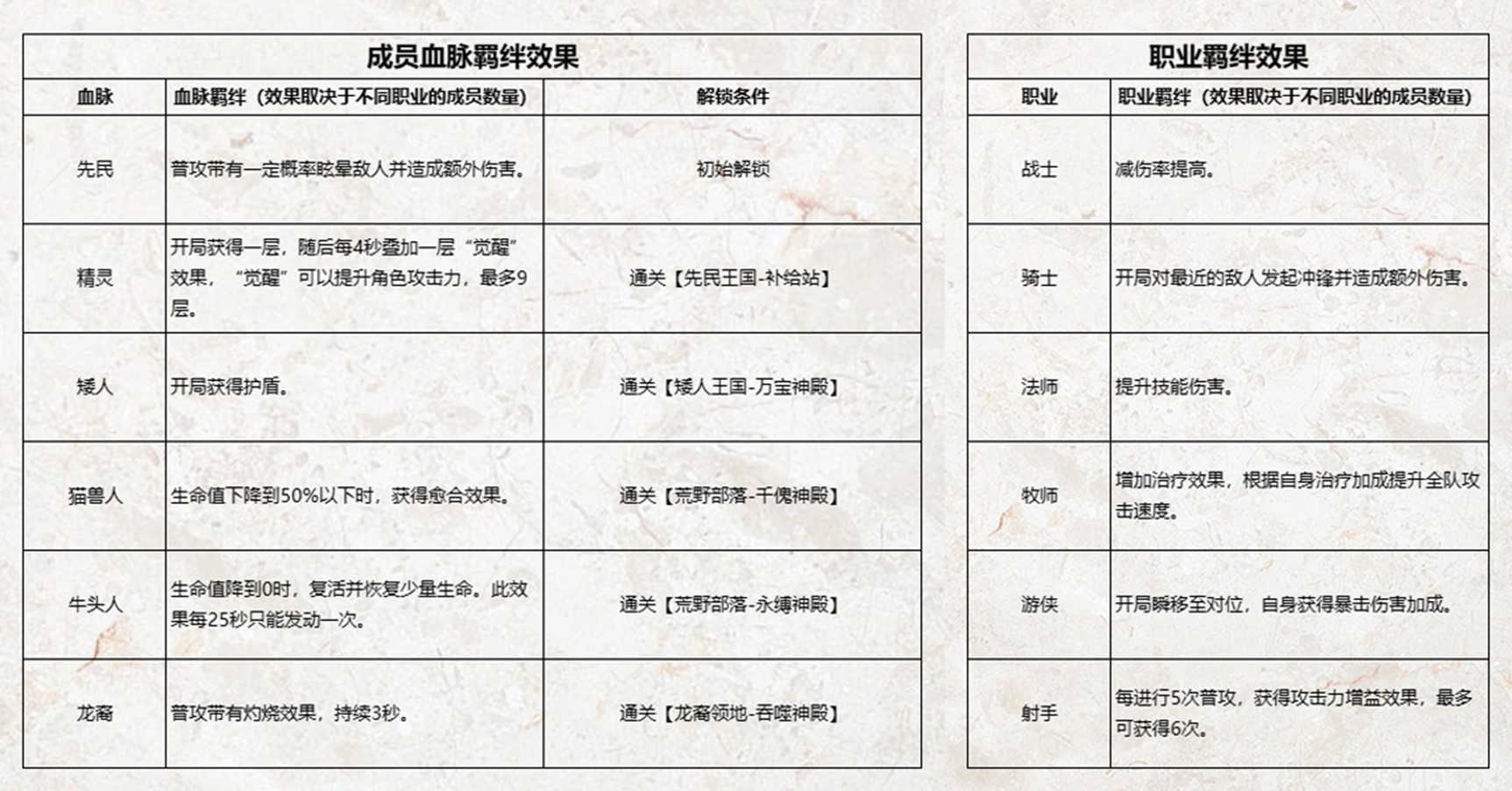 召集成员之后,点击成员可以进入成员查看页面,点击技能图标可以逐一查看技能的效果。其中,职业羁绊和血脉羁绊的效果会随着场上不同血脉/职业的成员数量增长而增强。目前我们一共有6个种族血脉、6种职业、每个种族血脉共有三种成员。由于血脉解锁有一定条件,为了方便大家查看,这边已经整理好了相关的图表供大家参考: