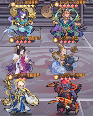 一号位:文殊菩萨;二号位:济公;三号位:不动明王;四号位:普贤菩萨/观音菩萨;五号位:紫霞仙子/唐三藏;六号位:地藏菩萨。