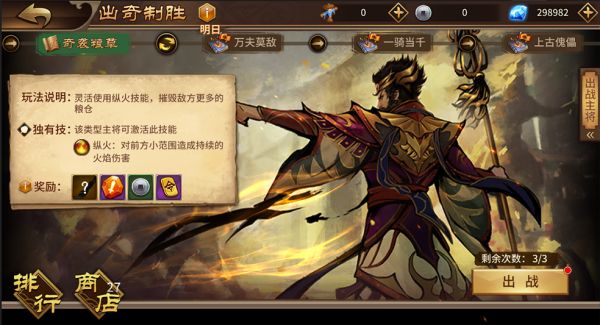 2.出战主将在某特定类型关卡(如一骑当千)的最高积分高于500分,则可以在这个特定关卡使用扫荡功能。