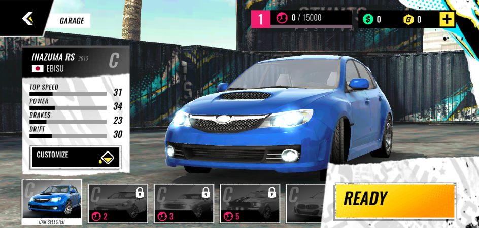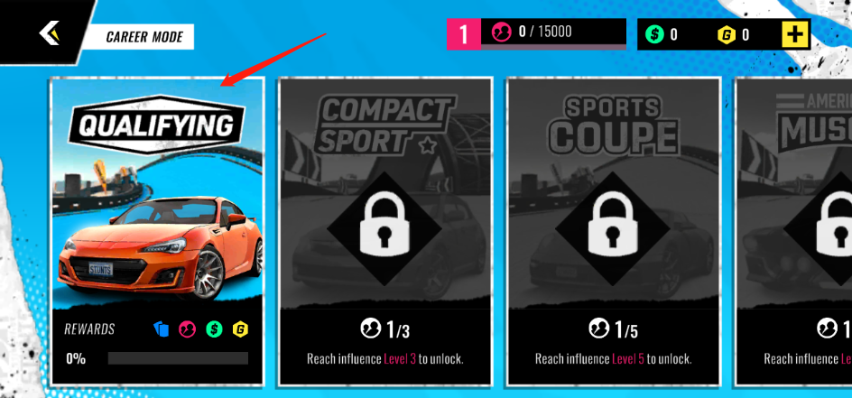 2、然后,在游戏开始前我们可以到车库解锁自己喜欢的赛车,赛车可分别为C、B、A、S等级,但是目前由于资金不足,暂时只有一辆车;然后直接点击右下角的黄色按钮会回到主页面,然后点击你想要玩的模式,这里选择的是职业模式;