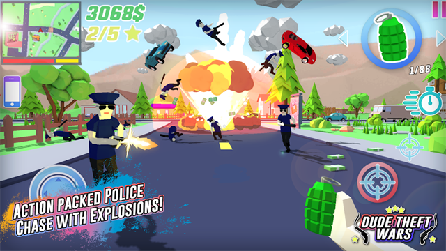 这款叫《恶人兄弟战争》的游戏挺有意思的,英文名字听起来像是“ Dude Theft Wars ”。它是一个像素风格的沙盒角色扮演手游,画面清新亮丽,玩起来特别自由。你可以在开放世界里扮演一个坏蛋,拿着枪做各种坏事,比如抢银行、行刺啥的,想干嘛就干嘛。不过干坏事的话警察肯定会来找你麻烦,被抓到就要坐牢哦!游戏里还有好多隐藏的地方可以探索,能找到各种稀有枪械。