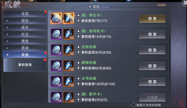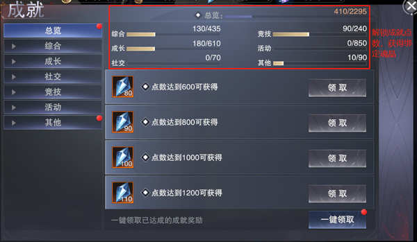 成就系统是记录每位勇士在克兰蒙多世界历程的总览,通过左上角个人页面访问成就系统。成就系统分为7项,分别是总览、综合、成长、社交、竞技、活动和其他。勇士每获得一项成就可以获得相应的成就点数,点数达到一定程度即可获得绑定魂晶。