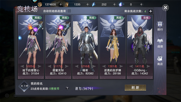 点击右下方的“刷新”按钮会随机刷新5个战力与自己匹配的对手玩家。点击想要挑战的对手,会弹出是否进行挑战的确认界面,如果点击“确认”会进入竞技场竞技。
