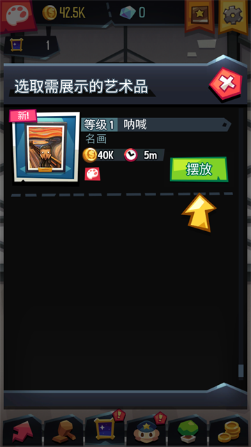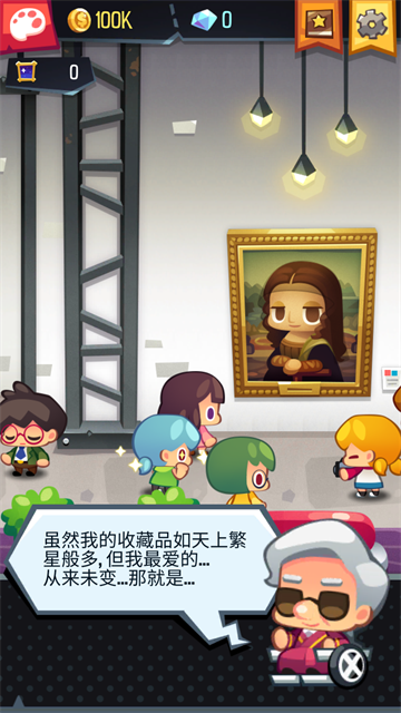 艺术大亨是一款新颖独特的放置模拟经营游戏,采用Q萌可爱的卡通画风制作,在这里你将经营着一家展览中心,通过竞拍获得各式各样的名画,将名画展览在展示厅供游客观看来获得收益,做好名画的安保工作,避免被小偷偷盗,与其他同行拍卖行竞争, 为你的艺术馆购买你想要的艺术品! 争夺珍贵的文物, 并使用花哨的技巧击败其他人。