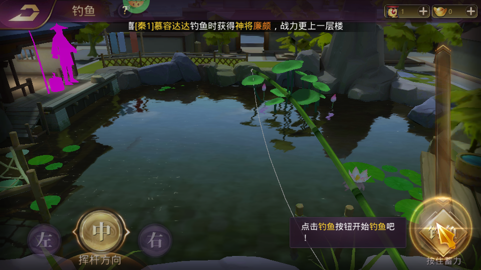 4、在游戏的鱼塘系统中,玩家可以进行钓鱼,每一次抛竿都是一次招募武将的机会。