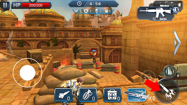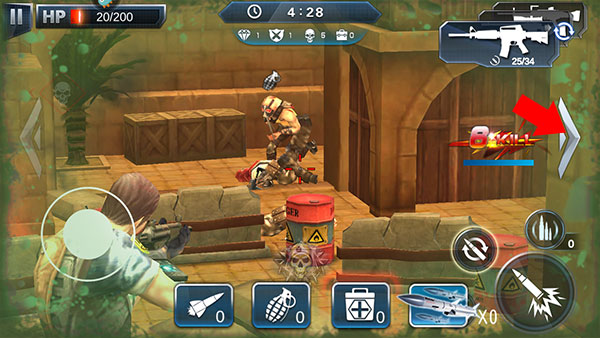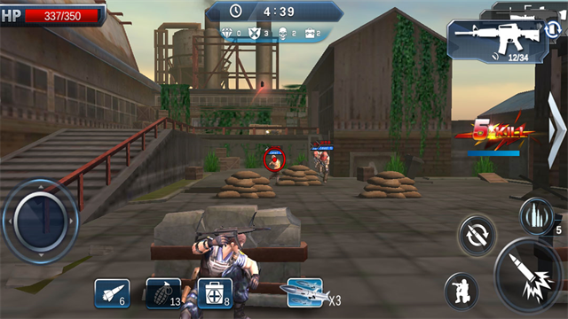 3、进入游戏后通过拖动屏幕来瞄准敌人,点击右下角的开火键即可移动出障碍物进行射击