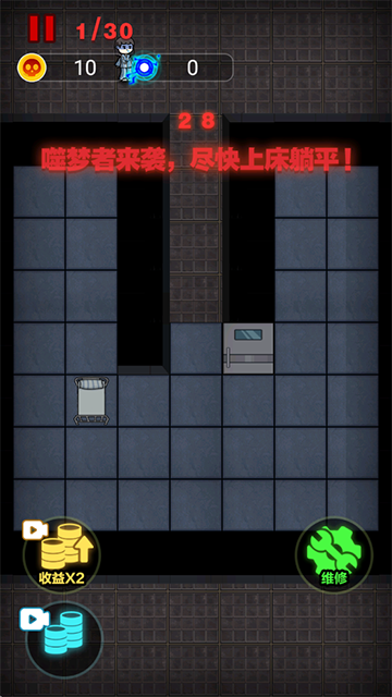 2、关门上床发育,建造武器,升级床和门,噬梦者攻击门的时候我们可以点击右下角的维修;