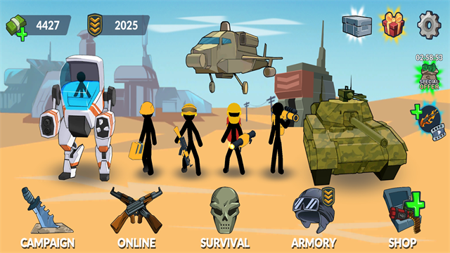 《火柴人世界大战》是一款策略战争手游,延续了经典的火柴人形象,但玩法更现代刺激。游戏结合了丰富的战斗模式和多样化的角色选择,玩家可以招募各种军事兵种,如喷火器、工程师、坦克甚至飞机大炮,体验紧张的战争氛围。