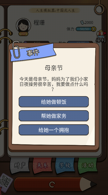 3、在游戏中会发生很多事件,在相应的随机事件中给出相应的选择可以增加自身的情商值。