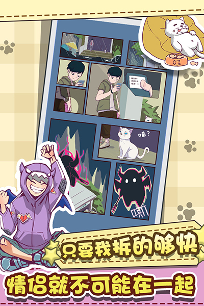 游戏还有一些特色和亮点,比如拒绝吃狗粮(也就是拒绝看别人秀恩爱)、见招拆招,越恩爱越容易被拆散等等。这些设定让人觉得这个游戏不仅有趣,还挺有挑战性的。不过,虽然游戏里是阻止情侣约会,现实中还是要尊重别人的感情哦!毕竟拆散别人的事还是交给游戏好了。