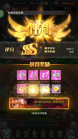 2、闯关、boss、小怪无限爆充值卡和欧皇红包,更有大量充值卡活跃就送,每日至少获得上万元充值卡,海量点券任意花