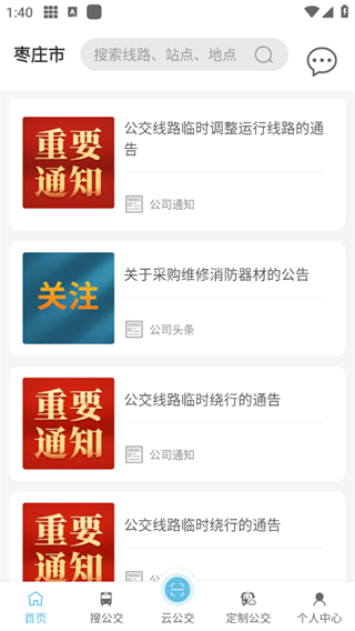 枣庄公交app还具备推送功能,一旦有公交线路调整、维护或其它重要信息的通知,用户就可以在手机上第一时间了解,从而及时调整自己的出行计划。有需要的用户欢迎前来下载体验!