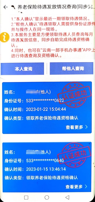 7、认证成功后,屏幕上会有一条盖有“认证成功”印章的记录,记录内容包含姓名、身份证号、确认时间、确认类型。点击“查看更多”可以看到“历史确认记录”信息。