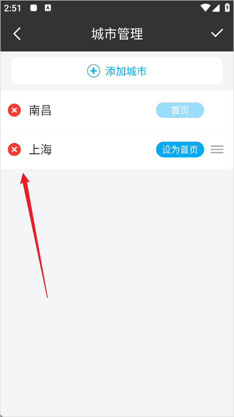 1、操作其实非常的简单,在城市管理功能中长按需要删除的城市