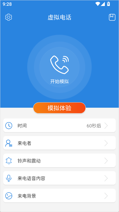 1、打开虚拟电话App后,直接进入虚拟来电创建界面,操作简单快捷。