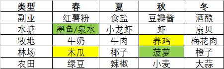 3、想少看广告懒得刷季节,但是又想把种子种在该种的季节,尽可能增产。同时也尽量在某个季节种作物时,其他田地是非空闲的状态,而食材也可以多获得。比如说香辣小龙虾和椰奶,食材大多在夏季,那么牧场这时候就空出来了,所以我选择了牛肉,做麻辣火锅,虽然牧场的概率其实很随机,也不一定完全出你想要的,但也许可能在夏季概率就大些呢...