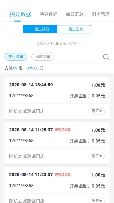 3、优惠券验证数据、一招过买单数据及财务拨款数据统计查询,方便财务对账;