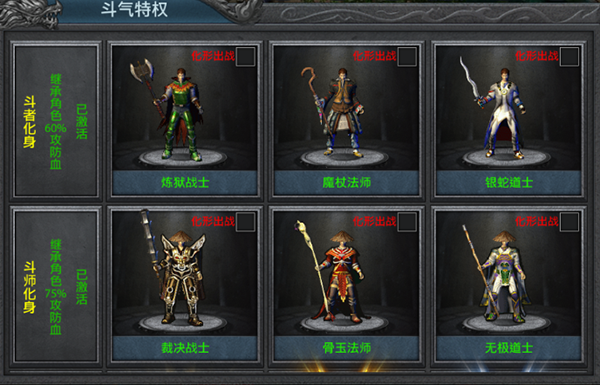 可消耗钻石购买斗气赞助等级,获得自动回收、战神化形以及属性提升等特权!安心挂机,快人一步!