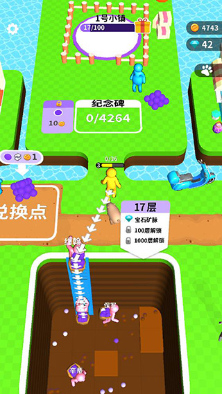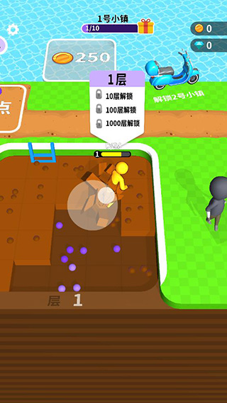 根据攻略,滑动屏幕就能控制角色挖土,挖到第三层还能获得海洋球,装满背包后去兑换点换金币,金币可以用来解锁各种建筑和工具。每个建筑都有独特功能,比如雇佣工人或购买宠物。不同颜色的海洋球兑换金币数量也不同,这点挺有意思的。
