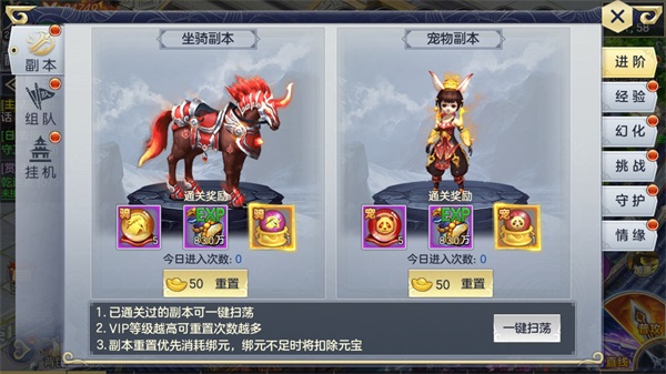 进阶副本每天只能进去打一次,而且无法使用扫荡,所以尽量每天在进入游戏后把每个进阶副本都做一下,得到珍贵的进阶丹和资质丹。在宠物副本解锁后,可以点击界面右方的“日常”按钮,在日常活动中找到“宠物进阶”,点击后即可进入宠物副本,当前宠物副本只有一关且副本难度不高,对战力的要求不高,进入后设置自动挂机即可完成任务领取奖励。完成宠物进阶副本后先别急着参加别的活动,在进阶副本界面下方可以花费20元宝再购买1次进入次数,相比在商城直接购买材料要划算很多,资金充足又想快速获得材料的玩家可以每日购买副本次数。