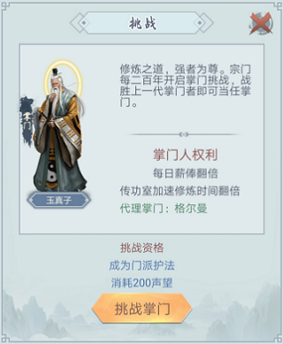 4、 挑战掌门,获取双倍的传功室修炼时间,加速修炼效率。