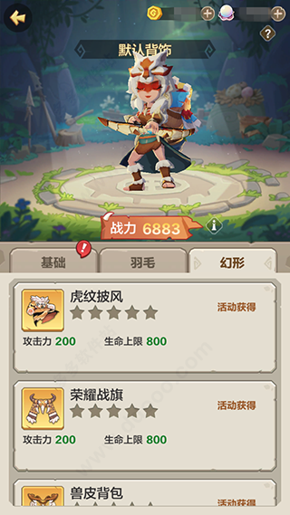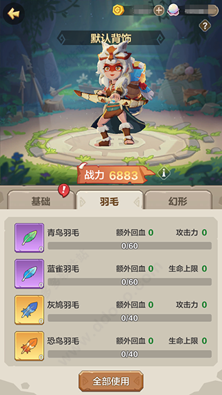点击进入背饰系统,背饰系统分为3个模块,基础,羽毛,幻形。