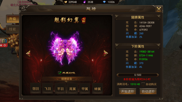 翅膀系统可以为角色提供攻击、防御、生命值、闪避、伤害加深属性;属性多样和强悍是背饰的属性特点!