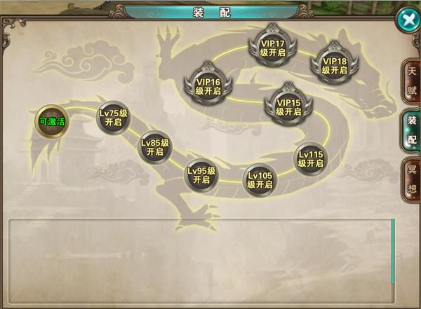 天赋只有在装配界面装备后才会获得天赋属性,每个角色最多可解锁10个天赋装备孔,前6个的天赋装备孔激活条件需要角色到达一定等级时,并花费绑定元宝解锁(绑元不足时可用元宝)。后4个天赋装备孔需要角色的VIP等级到达对应条件时并花费元宝解锁。
