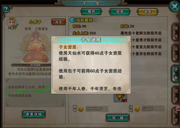 每当子女当前资质等级经验充满的时候可消耗对应材料突破资质,每突破一层资质,子女将获得额外的加成属性,资质等级达到特定等级时可解锁更多的属性,子女资质满层80层。