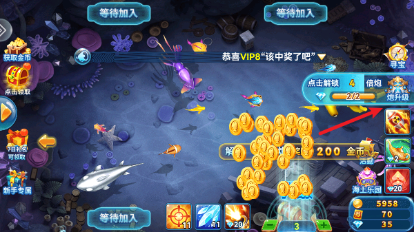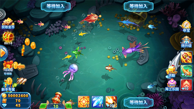 3、进入渔场,这里支持三人组队进行捕鱼。