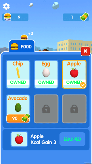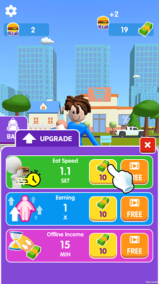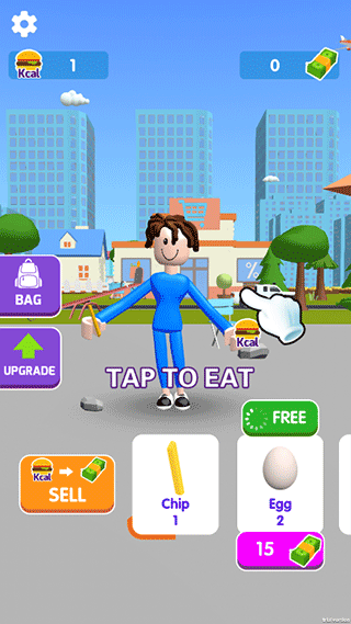2、进入游戏后,玩家将需要将自己打造一个绝对的吃货,点击屏幕可以让角色进行吃下方的食物,每个食物下方的数字代表吃完获得的金钱;