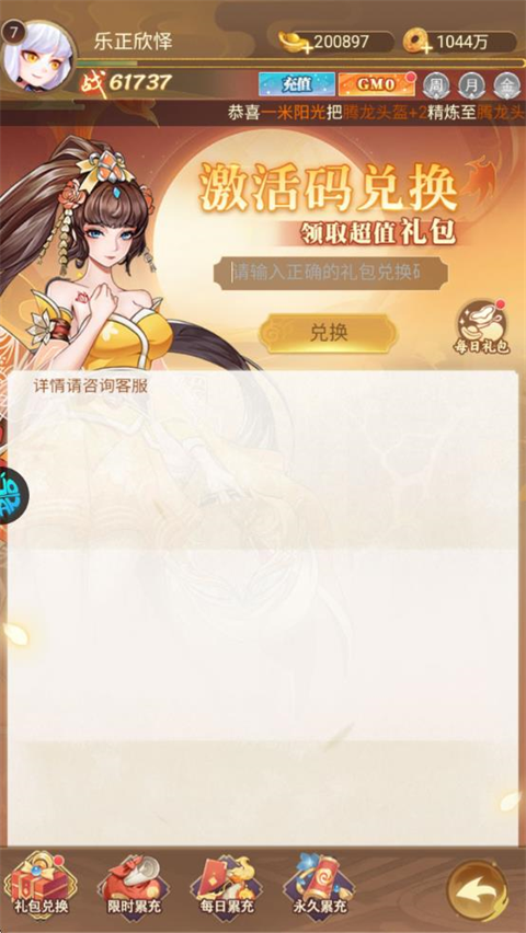 1、登录即领V25:VIP25、18.8w元宝、千万铜币、2024充值卡
