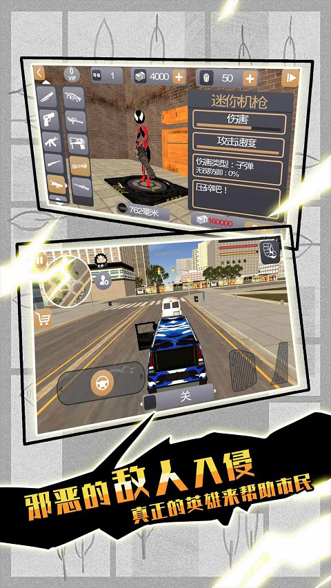 挑战过程中,您会遇到各种各样的敌人,包括超级恶棍和邪恶组织,面对越来越强的敌人,基础的蜘蛛能力显然不足以与之对抗,此时你可以在游戏商店购买多种武器,如蜘蛛网、剑和弓箭等,每个武器和技能都有其独特的属性和用途,玩家根据自己的喜好和战斗需求进行选择。