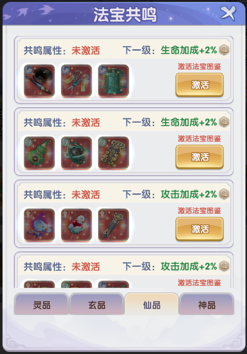 3、当共鸣组中的法宝均提升至指定星级,可提升共鸣属性的加成。
