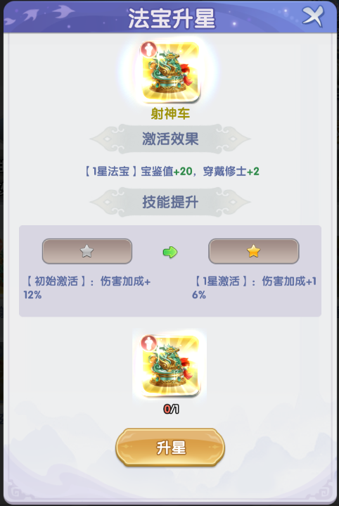 在修仙世界里,当道友修行至 25 级,便可开启藏宝阁玩法,只有达到6星的修士可穿戴法宝,修士星级越高,可解锁更多的法宝孔位。若想让法宝更加强力,可以消耗同名的法宝和低品法宝,进行法宝升星,增强法宝的穿戴效果。需要注意的是,法宝的效果和属性加成只在战斗中生效。