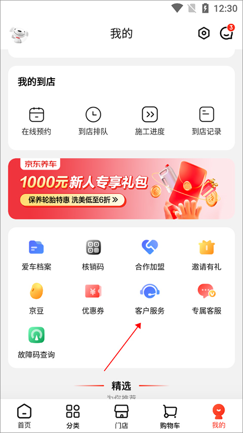 1、用户可以打开并登录京东养车app,进入【我的】页面中点击【客户服务】