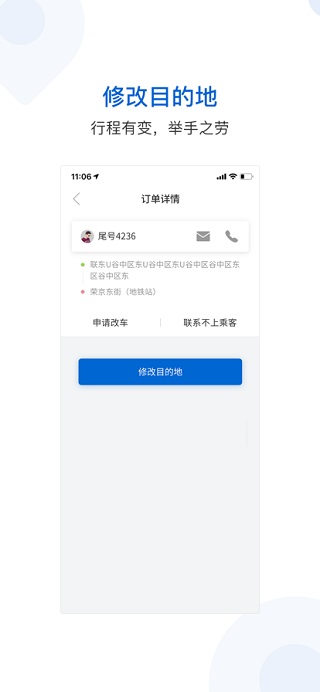 6、灵活的订单处理工具,为用户提供了申请改车、修改目的地及联系不上乘客等灵活的订单处理工具。
