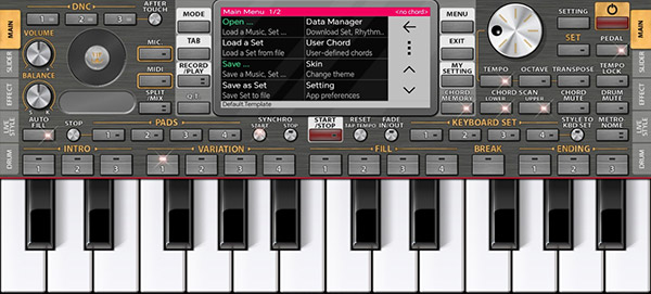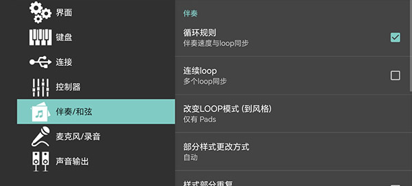 此部分包括四个选项:声音/循环、键盘设置、风格选择和和弦/迷你键盘