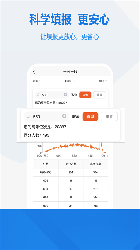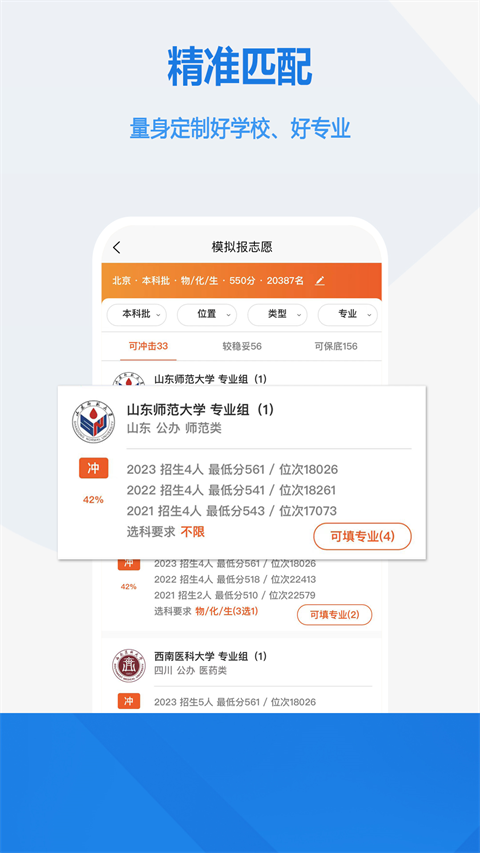 2、依据全国高校历年收分情况、招生计划以及大学志愿目标专业等数据,结合高考成绩和志愿填报规则,让您轻松填报志愿。