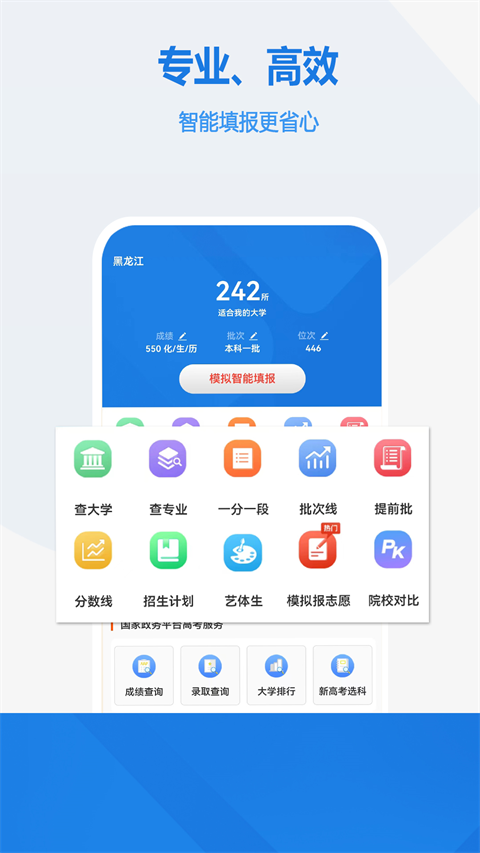 1、智能匹配: 根据考生高考分数、排名、省份和文理科等数据,测算出可冲击、较稳妥和可保底的报考大学,同时提供详细的学校分析报告。