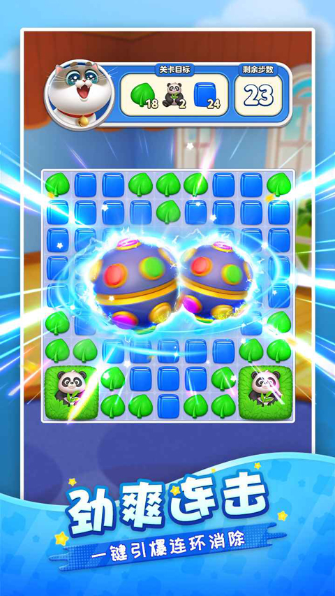 《假日乐消消》头牌心灵理疗师是一只名叫毛毛的猫咪,无论闯关还是建造,它都陪伴左右——欢呼鼓励、傲娇卖萌,又或是调皮捣蛋。消除闯关,即可与它亲密互动。